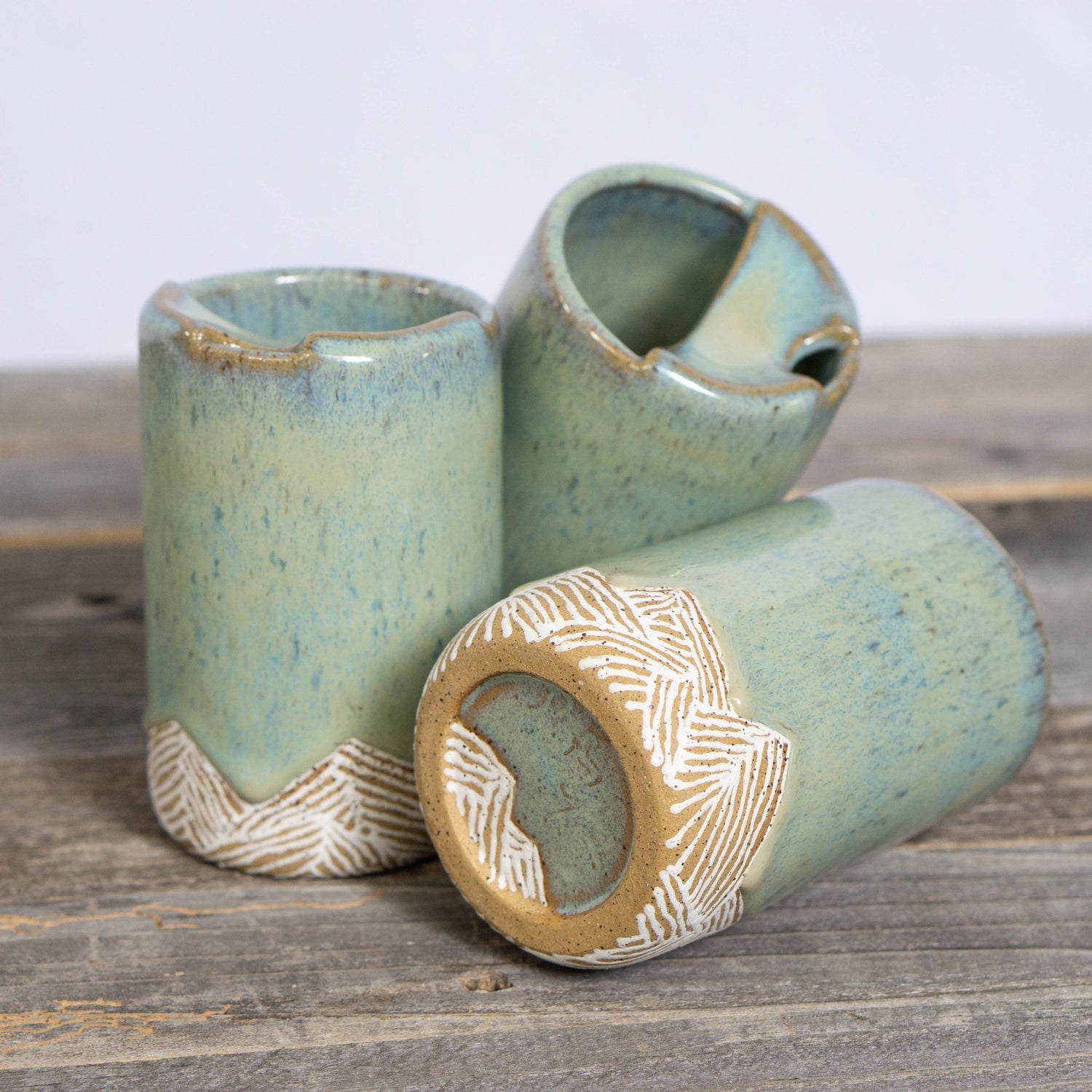 These mugs contrast the beauty of bare stoneware with carved underglaze mountains...
