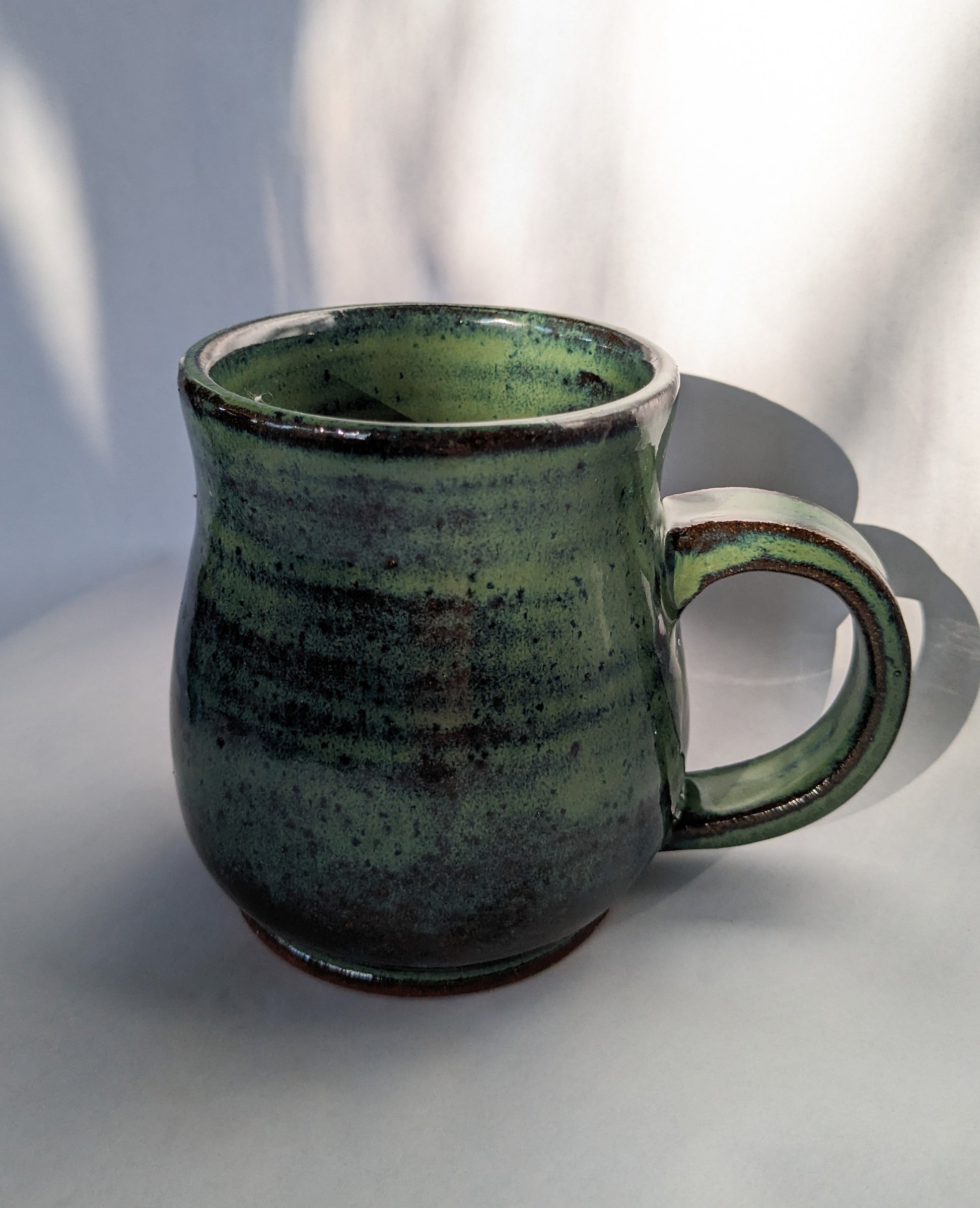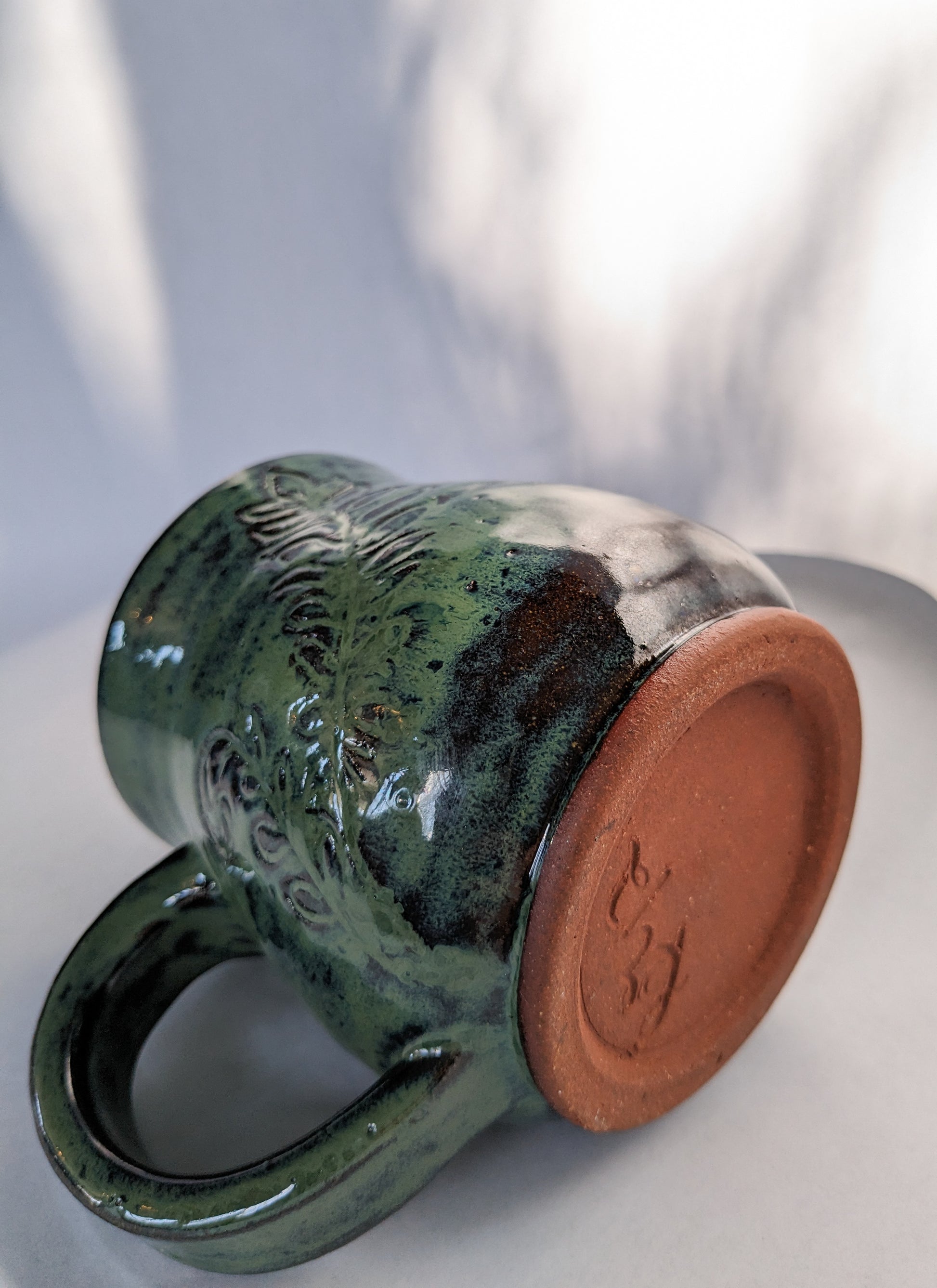 This 11 oz capacity curvy fern mug boasts beautiful variation in it's green blue glaze on red stoneware. Hand carved ferns add a subtle touch to this one-of-a-kind mug.