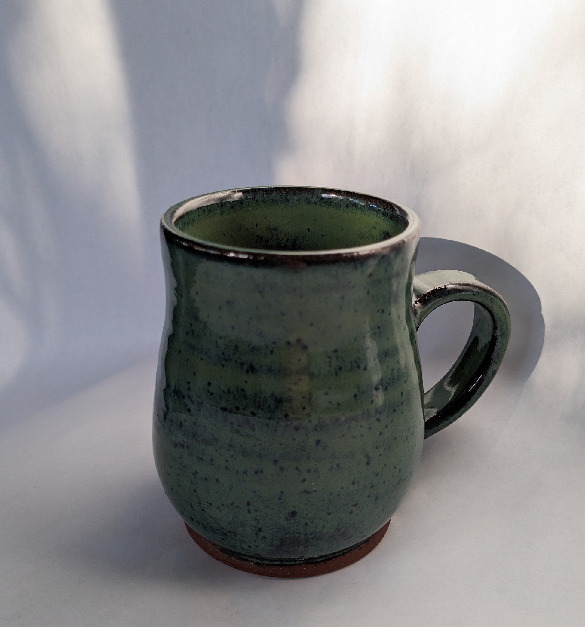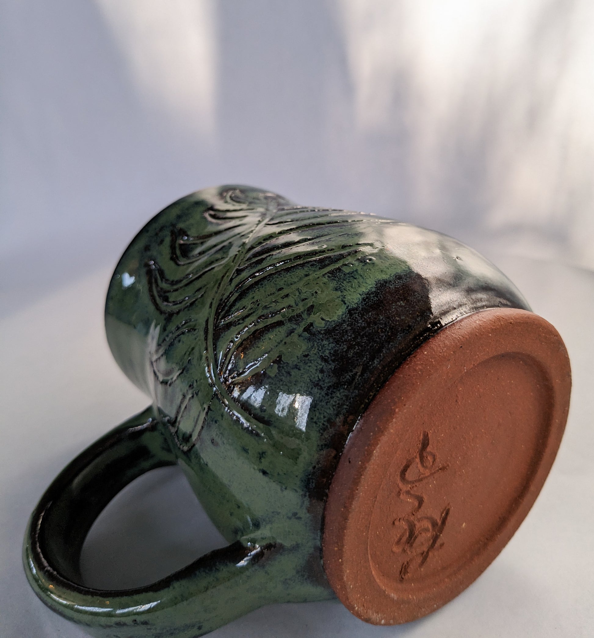 This curvy fern mug holds 11 oz and features a gorgeous greenish-blue glaze over red stoneware, with a unique hand-carved fern frond design.