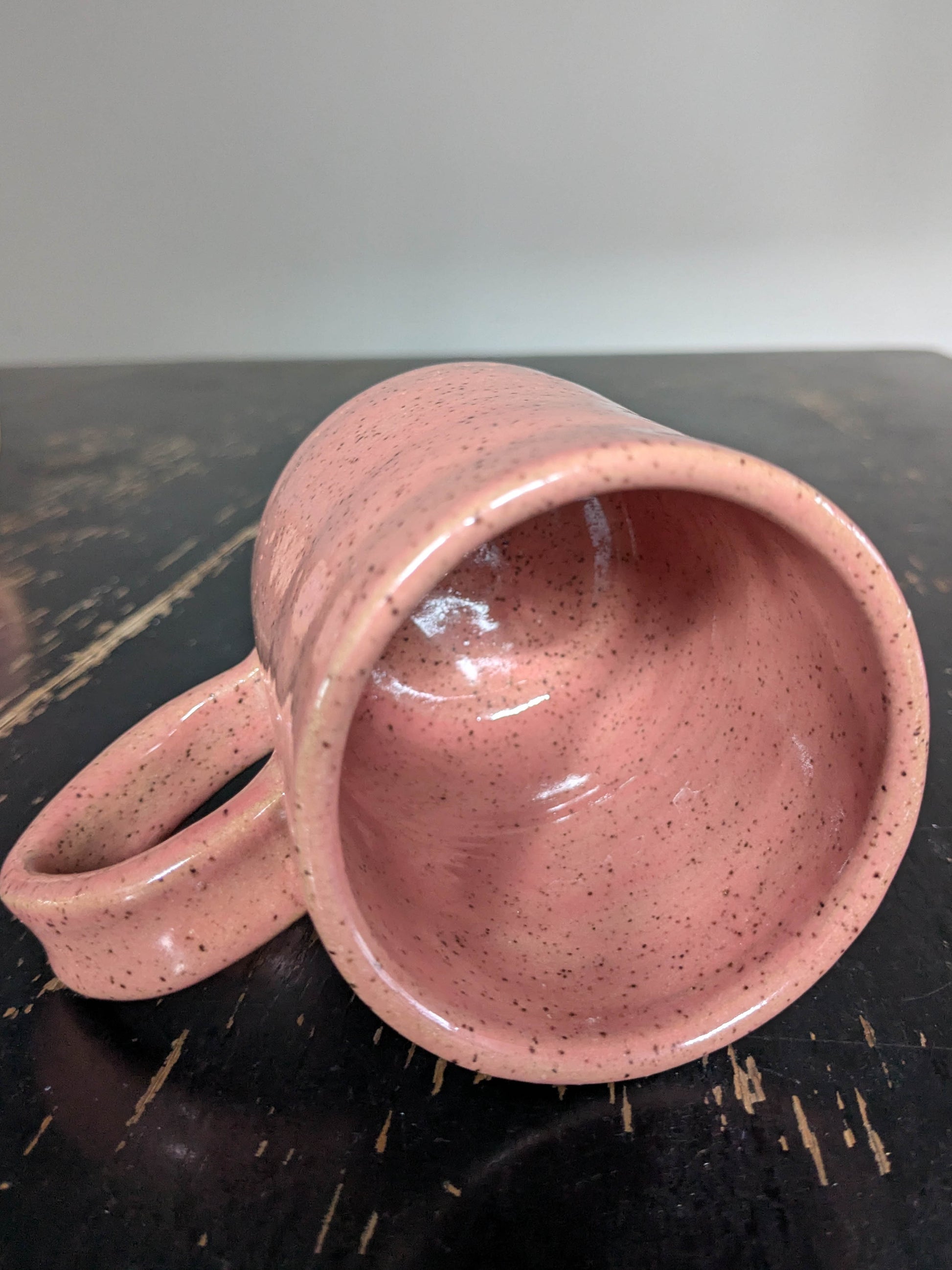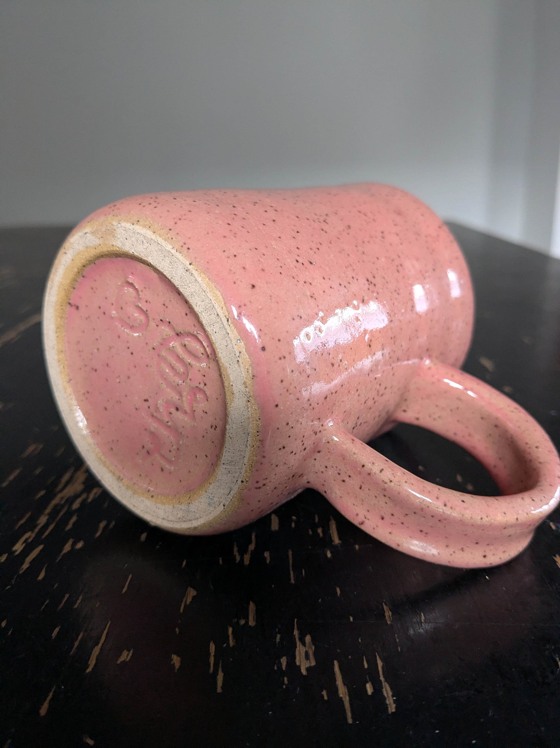 This mug was thrown in speckled buff clay. It features pink glaze and hand stenciled white hearts with a gold overglaze. Please note, the hand painted gold requires special care to maintain its stunning shine (this overglaze has real gold!). This mug holds 13oz. See below for maintenance tips!